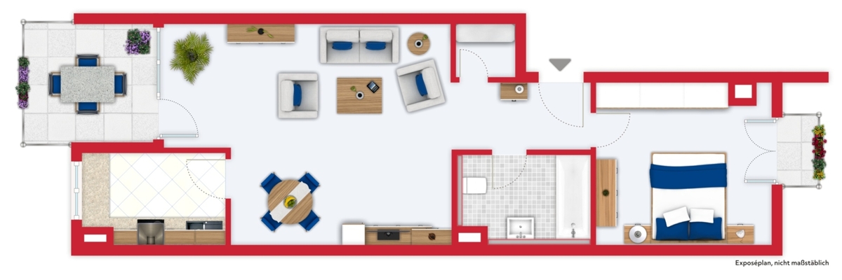 Das Schlafzimmer liegt direkt neben dem Bad mit WC und ist über die Eingangsflur erreichbar.